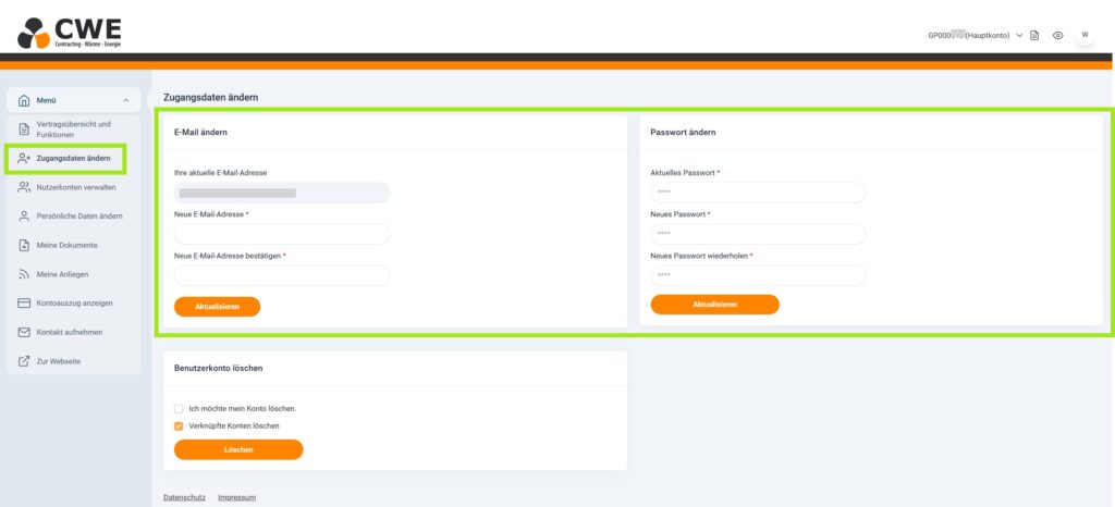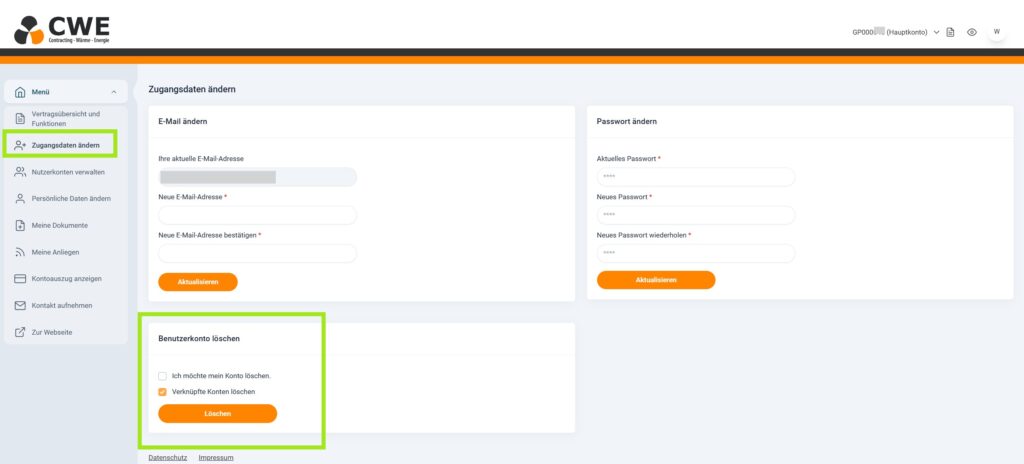 Unter „Zugangsdaten ändern“ finden Sie den Button „Benutzerkonto löschen“. Das Löschen des Benutzerkontos bezieht sich lediglich auf Ihren Zugang zum Kundenportal. Vertragsdaten und sämtliche Daten zu Abrechnungen, Verbrauch usw. bleiben in unserem Abrechnungssystem unverändert bestehen und sind bei einer erneuten Anmeldung wieder nutzbar.