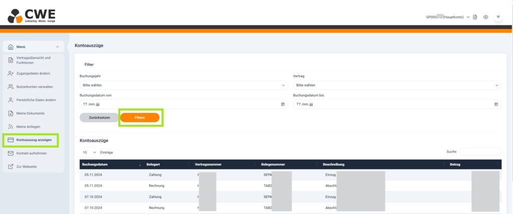 Hier sehen Sie alle Kontobewegungen aus unserem Abrechnungssystem, die mit dem angemeldeten CWE-Wärmelieferungskunden in Verbindung stehen.