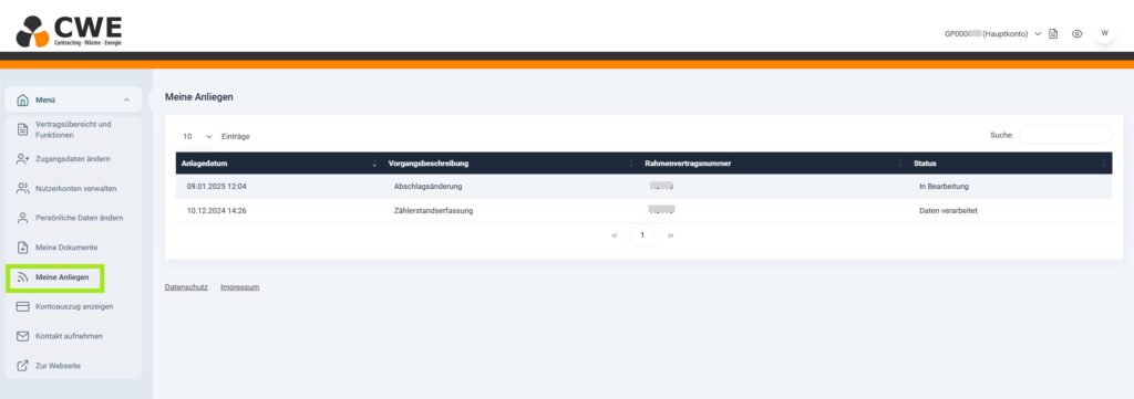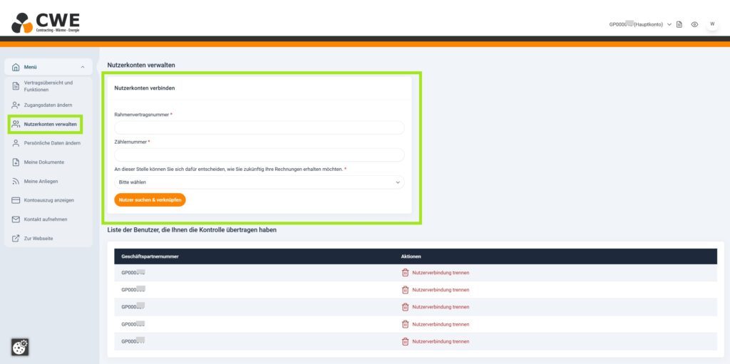 Die Bezeichnung „GP000XXX (Hauptkonto)“ ist die Nummer des CWE-Kunden, für den Sie sich angemeldet haben.