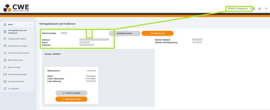 Ein Kunde kann bei CWE mehrere Wärmelieferungsverträge für unterschiedliche Objekte führen. In diesem Fall können Sie unter dem Menüpunkt „Vertragsübersicht und Funktionen“ über den Filter „Rahmenverträge“ die Objekte auswählen, für die Informationen angezeigt werden sollen.