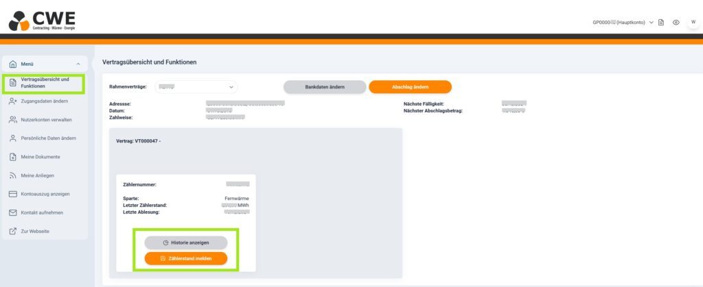 Unter „Vertragsübersicht und Funktionen“ finden Sie Daten zu den Abrechnungszählern. Hier können Sie über „Zählerstand melden“ einen neuen Wert übermitteln.