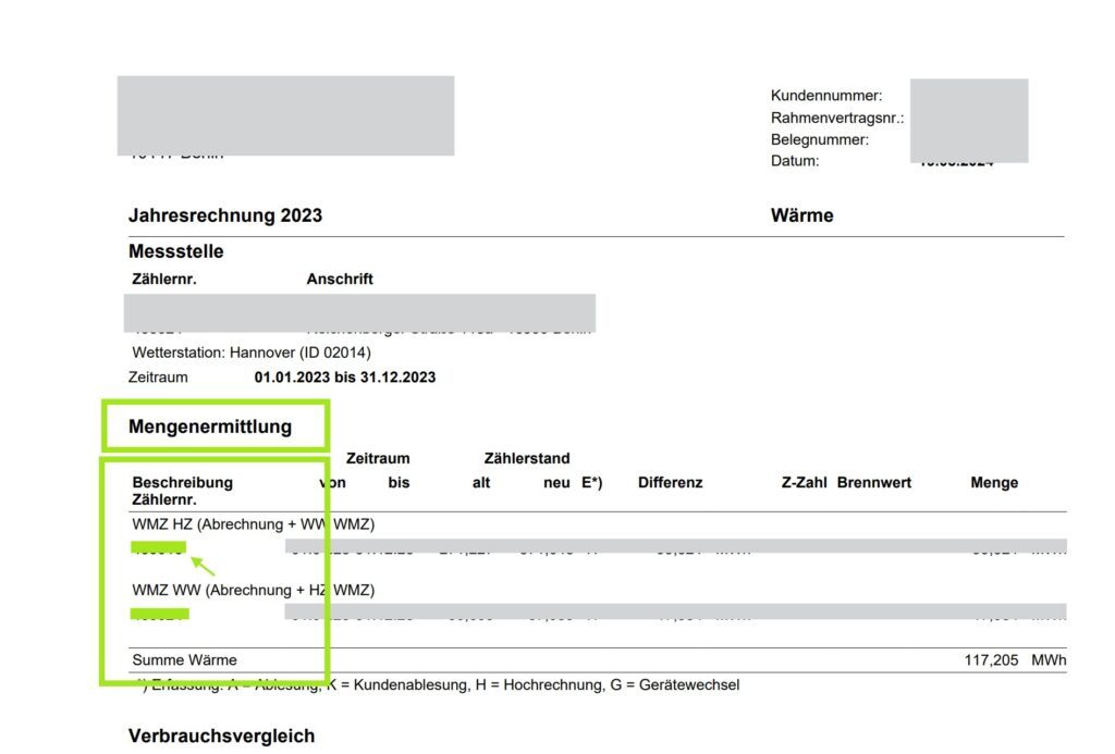 • Zählernummer Ihres Wärmemengenzählers (auf Seite 3 der Jahresabrechnung im Abschnitt „Mengenermittlung“. Falls dort mehrere Wärmemengenzähler aufgeführt sind, müssen Sie nur einen davon eingeben.) und